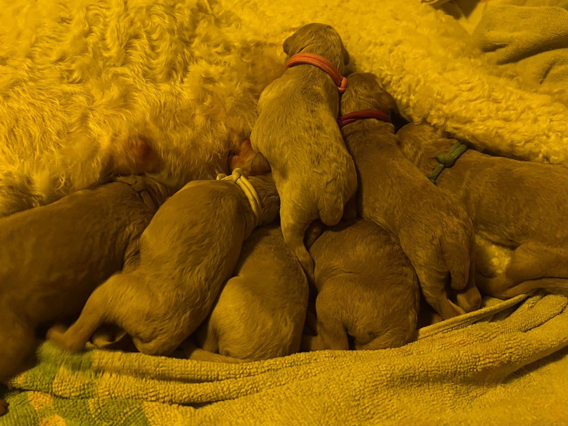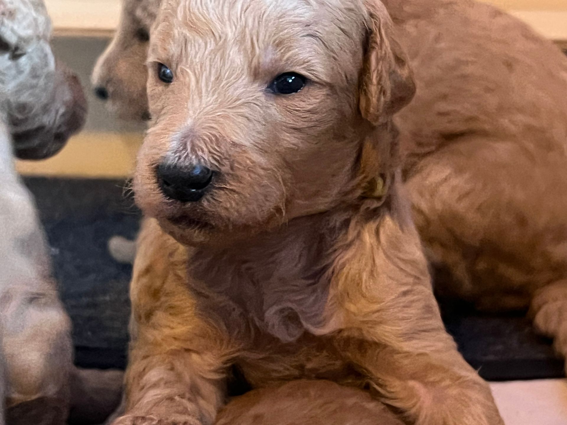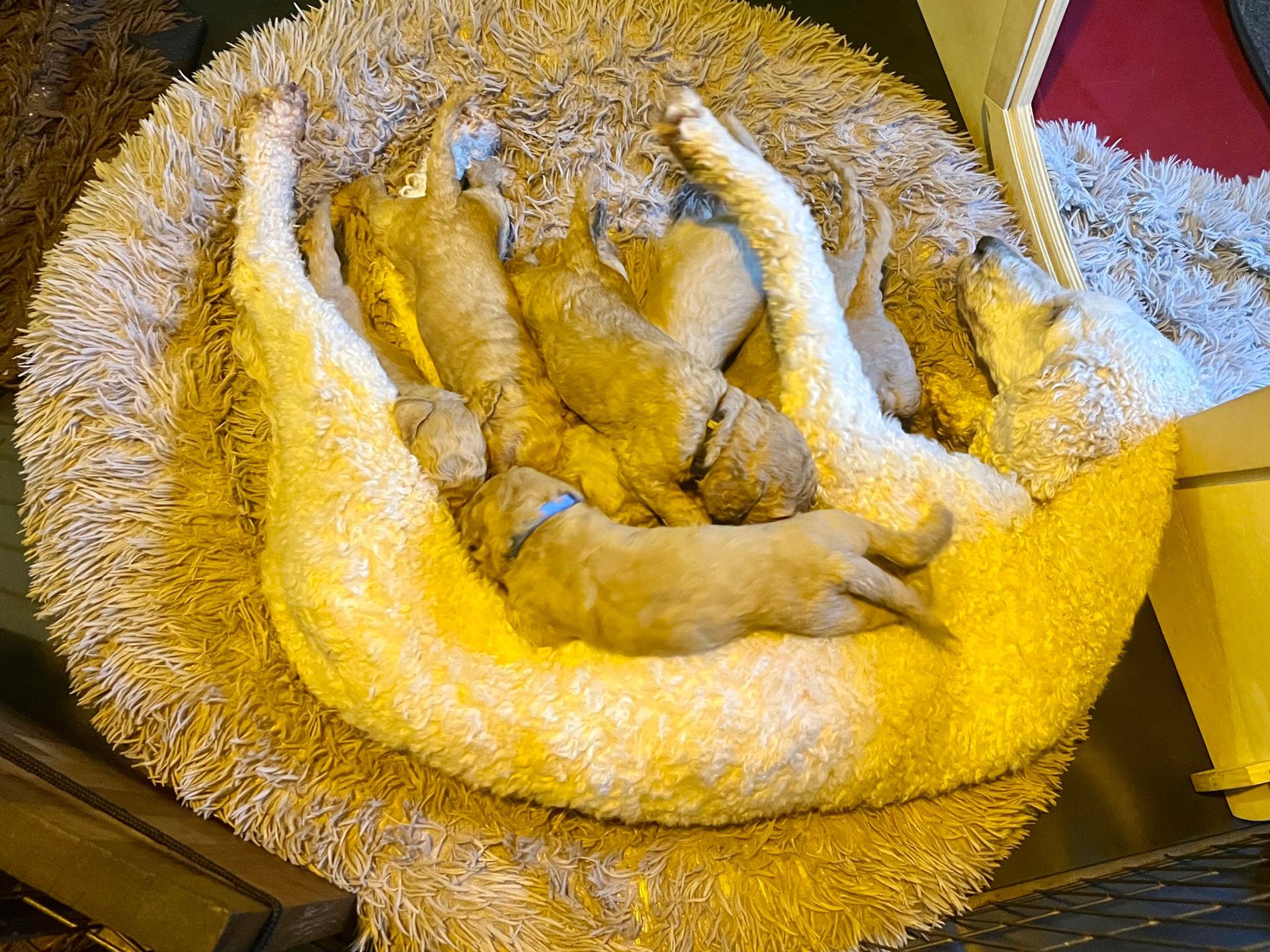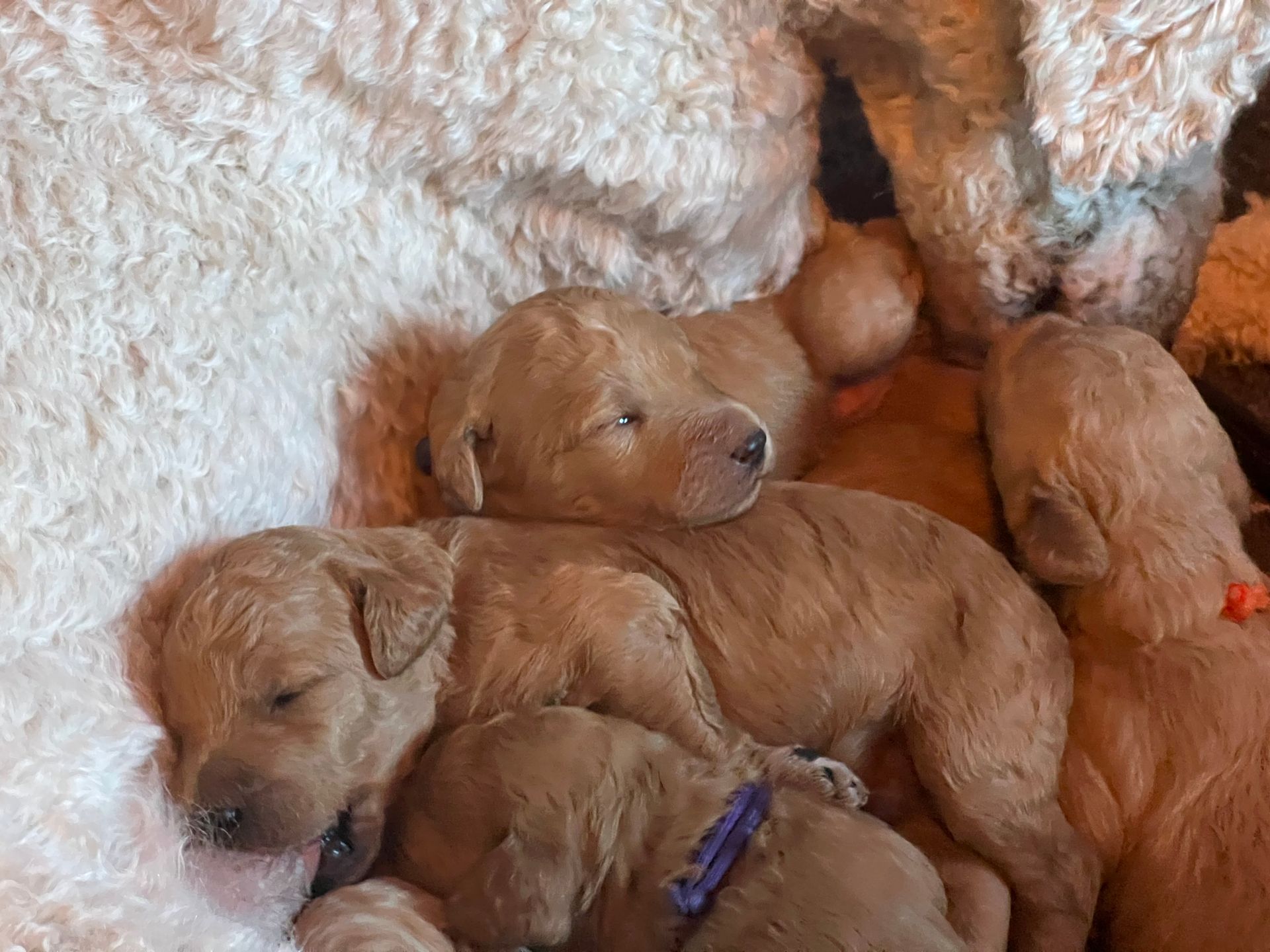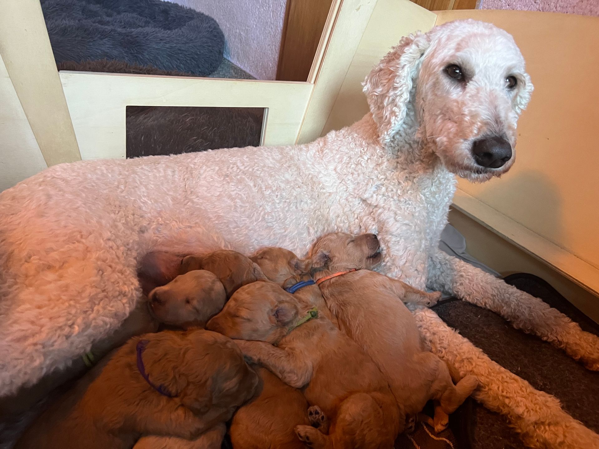 Am 17.12.2025 sind die lustige Lotta "Crazy vom Huftempel" und der liebevolle Frodo "Xanthos vom Chateau de Fontainebleau" stolze Eltern von putzmunteren, zuckersüßen, reinrassigen Königspudel Welpen geworden. Die kleinen Lockenköpfe haben verschiedene apricot Farbtöne.